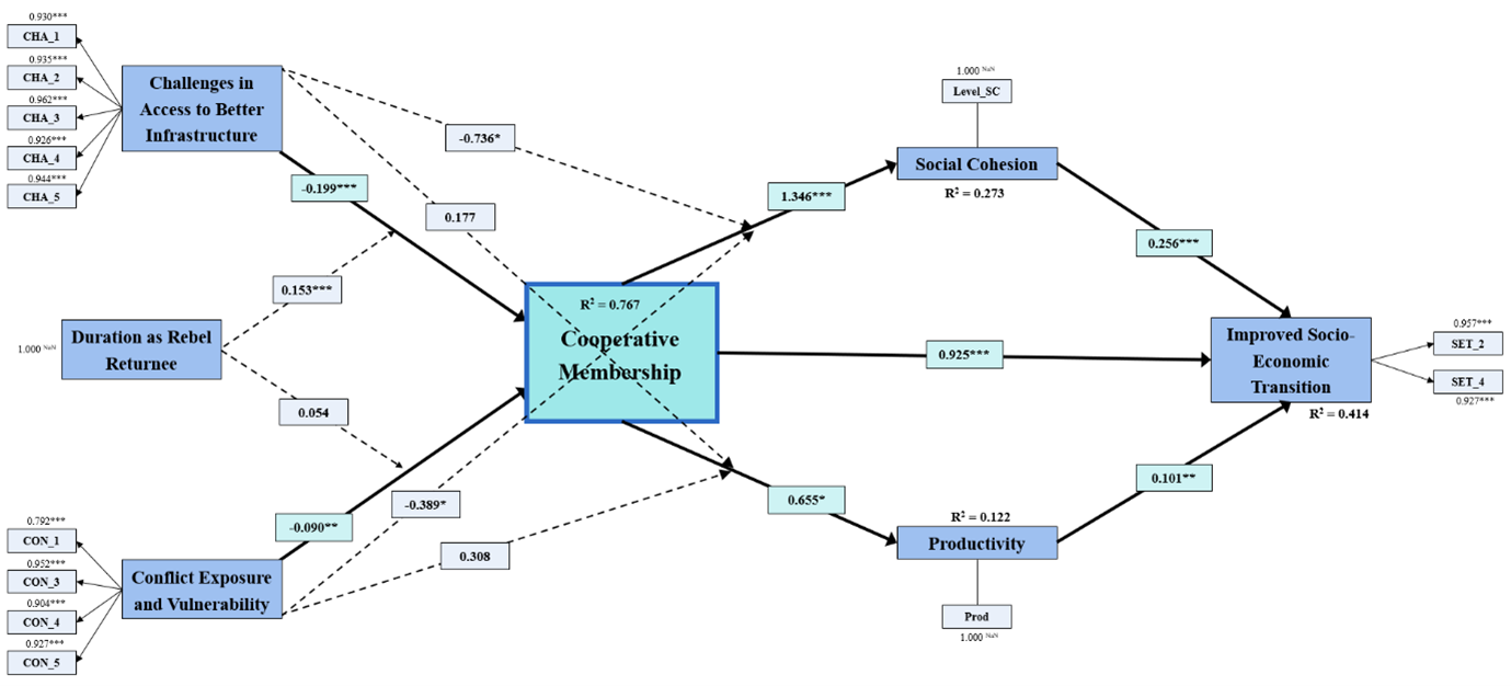 The study employed a comparative cross-sectional design, combining descriptive statistics, regression models, and Partial Least Squares Structural Equation Modelling (PLS-SEM) to identify the underlying mechanisms of reintegration. While the quantitative results were central, the human stories behind the data were equally revealing. Many participants described how joining the cooperative not only improved their coffee yields but also helped them regain a sense of purpose and belonging after years of dislocation caused by armed conflict.