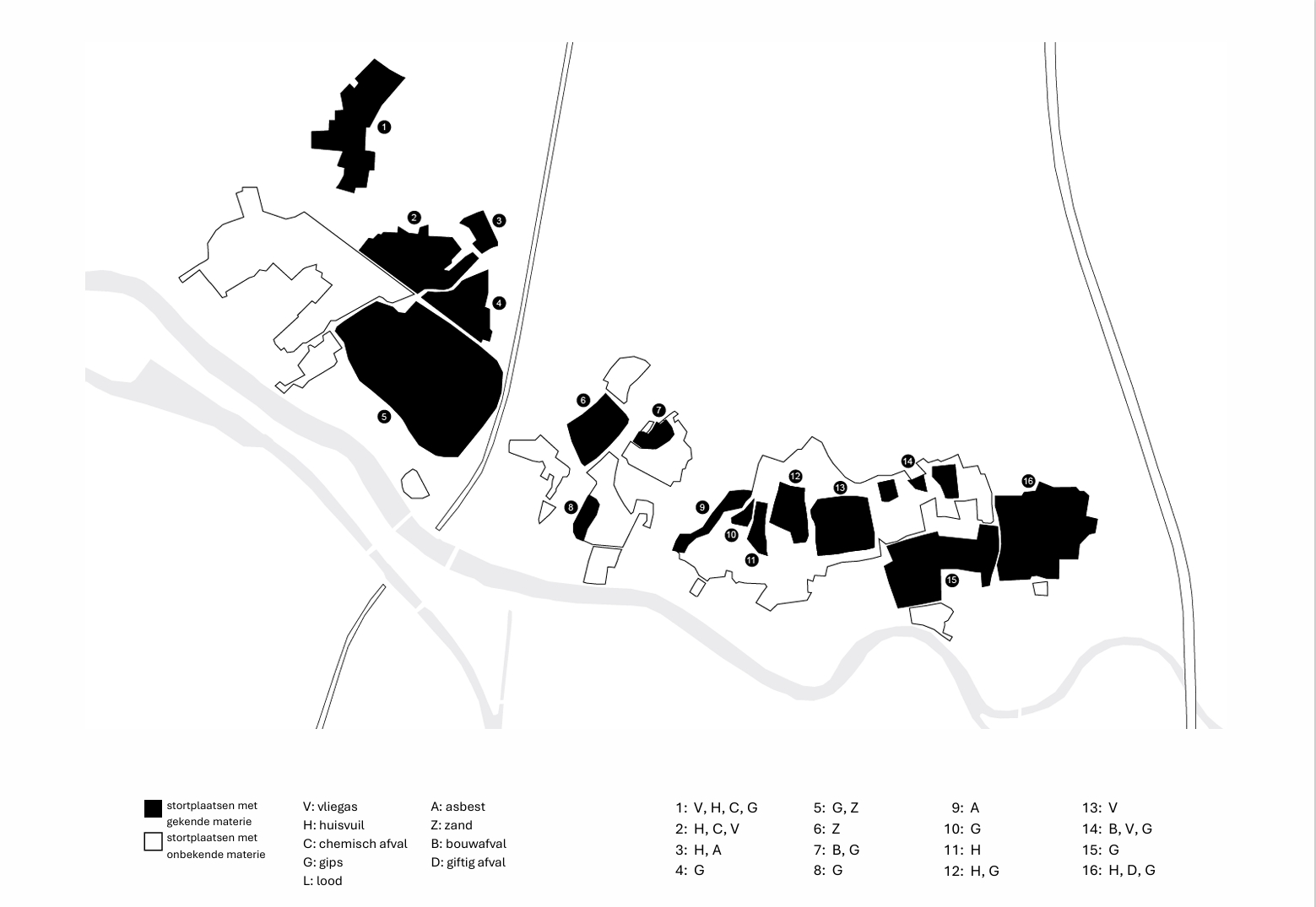 1. Asbest: Multinational Eternit, een grote producent van asbest-cement, stortte dit materiaal in de putten. Hoewel Eternit in 1978 beweerde dat asbestcement bij normaal gebruik geen gevaar opleverde, kwamen de risico’s bij storten en afbraak wel aan het licht. Vandaag is de enige grootschalige oplossing voor verwijderd asbest in Vlaanderen nog steeds het storten ervan.