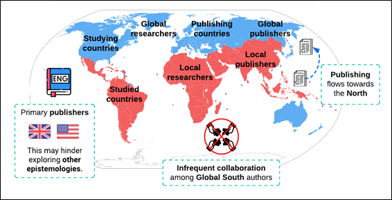 This issue may be linked to certain patterns and trends related to the geopolitical distribution and the state of the knowledge shared by FAO. On the one hand, there are asymmetries between Global North and Global South countries in the generation and dissemination of knowledge on agroecology. This reflects a broader pattern of the coloniality of knowledge, where the Global North is seen as the primary source of valid knowledge, with English as the dominant language. This dynamic perpetuates and reinforces the Western Worldview—common to the Global North—which assumes, among other things, a fundamental division between humans and nature. The following figure illustrates the asymmetries between Global North and South countries.