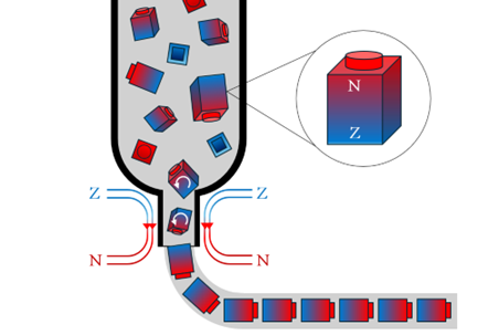 Het tweede onderdeel berust op hetzelfde principe als een kompasnaald: net zoals de naald zich volgens het magnetische veld richt, zullen we de kristallen laten roteren. Om dit te bereiken, worden de kristallen eerst blootgesteld aan een sterk magnetisch veld van 1,6 Tesla, waardoor ze veranderen in kleine permanente magneten.