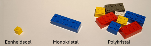 Om je beter in te beelden hoe dit materiaal wordt opgebouwd, kun je je het Atomium voorstellen. Dit bouwwerk toont een kubusvormige eenheidscel van een ijzerkristal, waarbij de bollen ijzeratomen voorstellen. Wanneer meerdere eenheidscellen perfect gestapeld worden, vormen ze een monokristal. Alle objecten uit metaal zijn opgebouwd uit dergelijke grote ijzer monokristallen die samen een polykristal vormen, waarbij elk kristal een afzonderlijke oriëntatie inneemt.