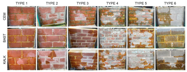 Kalkmortel presteerde beter dan cementmortel: hoewel de muren meer water opnamen, werd er minder kleurstof in de isolatie geactiveerd. Kalkmortel werkt als een vochtbuffer: het neemt veel water op, maar houdt het ook veel beter vast, vergelijkbaar met een spons. Daartegenover is cementmortel eerder als een kurk in de baksteenmuur: redelijk waterdicht, maar bij defecten stroomt water gemakkelijk naar binnen. En net zulke defecten zoals scheuren tijdens de bouw bleken cruciaal voor de regendichtheid van het metselwerk.