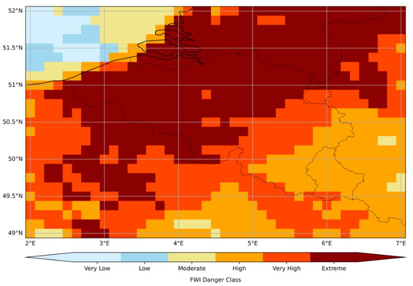 De Belgische natuurparken worden gedurende de hele zomer geteisterd door bosbranden. Op 15 juni waarschuwt Copernicus voor extreem brandgevaar over heel Vlaanderen. De Fire Weather Index, een numerieke indicator voor brandgevaar, neemt ter hoogte van de Kalmthoutse Heide die dag een historische recordwaarde aan.