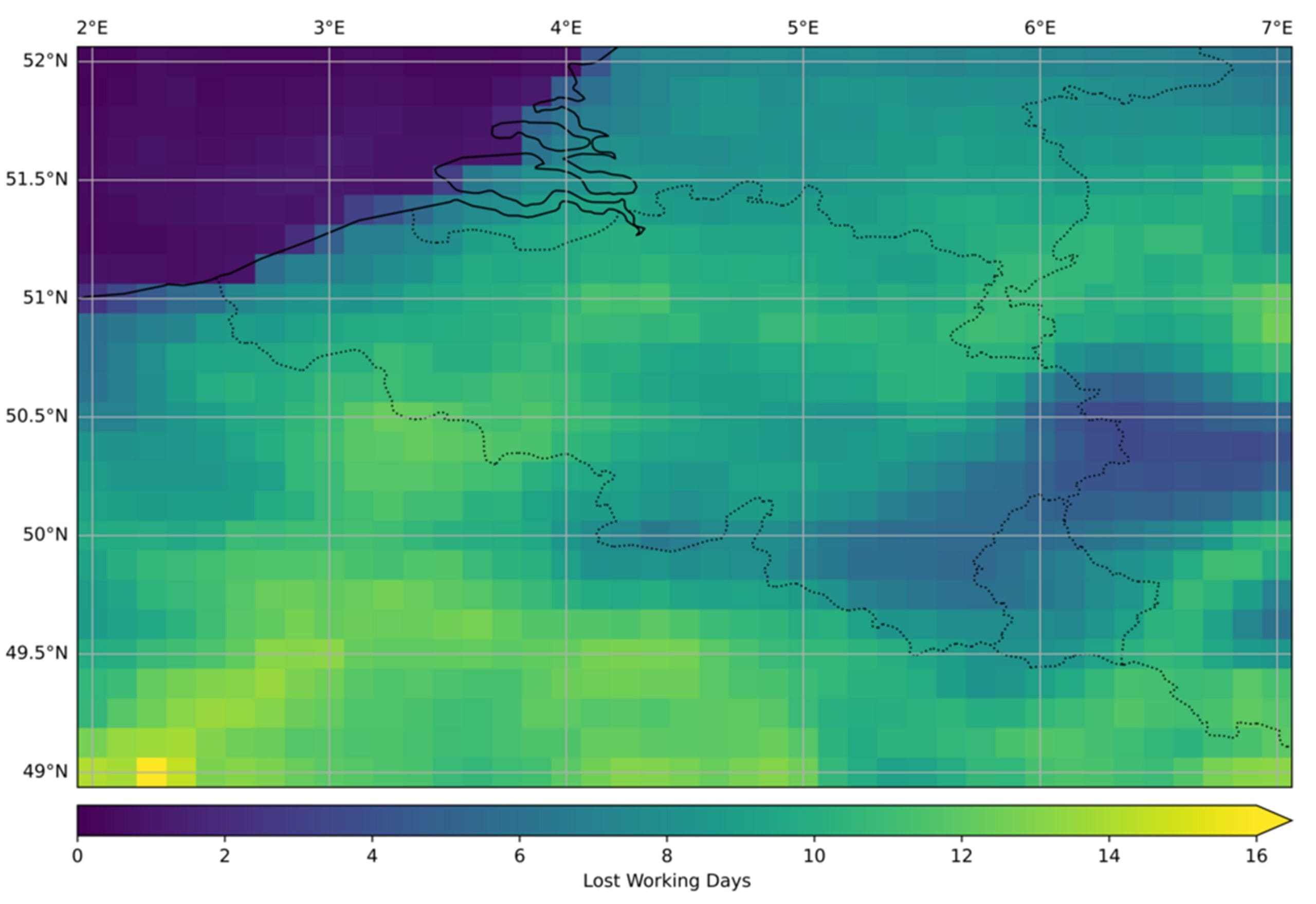 Die energie is nodig, want nog nooit was zo veel nood aan koeling van residentiële gebouwen. Reeds voor de officiële start van de zomer wordt de alarmfase van het federaal hitteplan afgekondigd.Er moeten onder andere maatregelen genomen worden op de werkvloer: zwaar werk in open lucht, zoals op bouwwerven, moet geregeld stilgelegd worden zodra de drempelwaarden voor de Wet Bulb Globe Temperature worden overgeschreven. Dat is een grootheid die de excessieve blootstelling van het menselijk lichaam aan extreme hitte in kaart brengt. Naar schatting verloren de bouw- en landbouwsectoren in de meeste Vlaamse steden hierdoor ongeveer 15 volledige werkdagen.